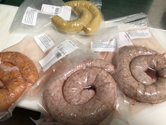 Vi har dette utvalget; salsiccia pølser med fennikel, karri pølser, løkpølser og kjøttdeig.